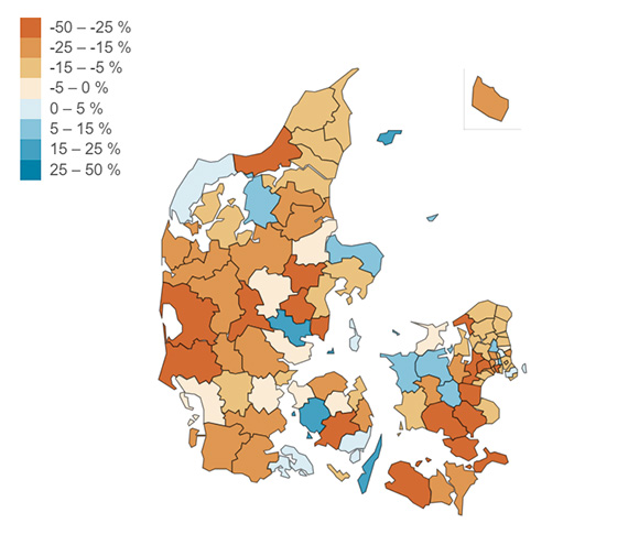Faxe Kommune har det største fald; næsten en halvering fra 13 til 7 pct., der cykler til job eller uddannelse mindst tre gange ugentligt. I forvejen er Faxe en af de kommuner, hvor ret få cykler til job i forhold til landsgennemsnittet på 26 pct. Også i Jammerbugt, Høje-Taastrup og Næstved Kommuner er der sket markante fald.