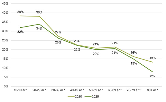 - 15-19-årige: 38 pct. cyklede til uddannelse eller arbejde mindst en gang om ugen i 2020. I 2025 gjaldt det kun 32 pct. Det svarer til en nedgang på 16 pct.