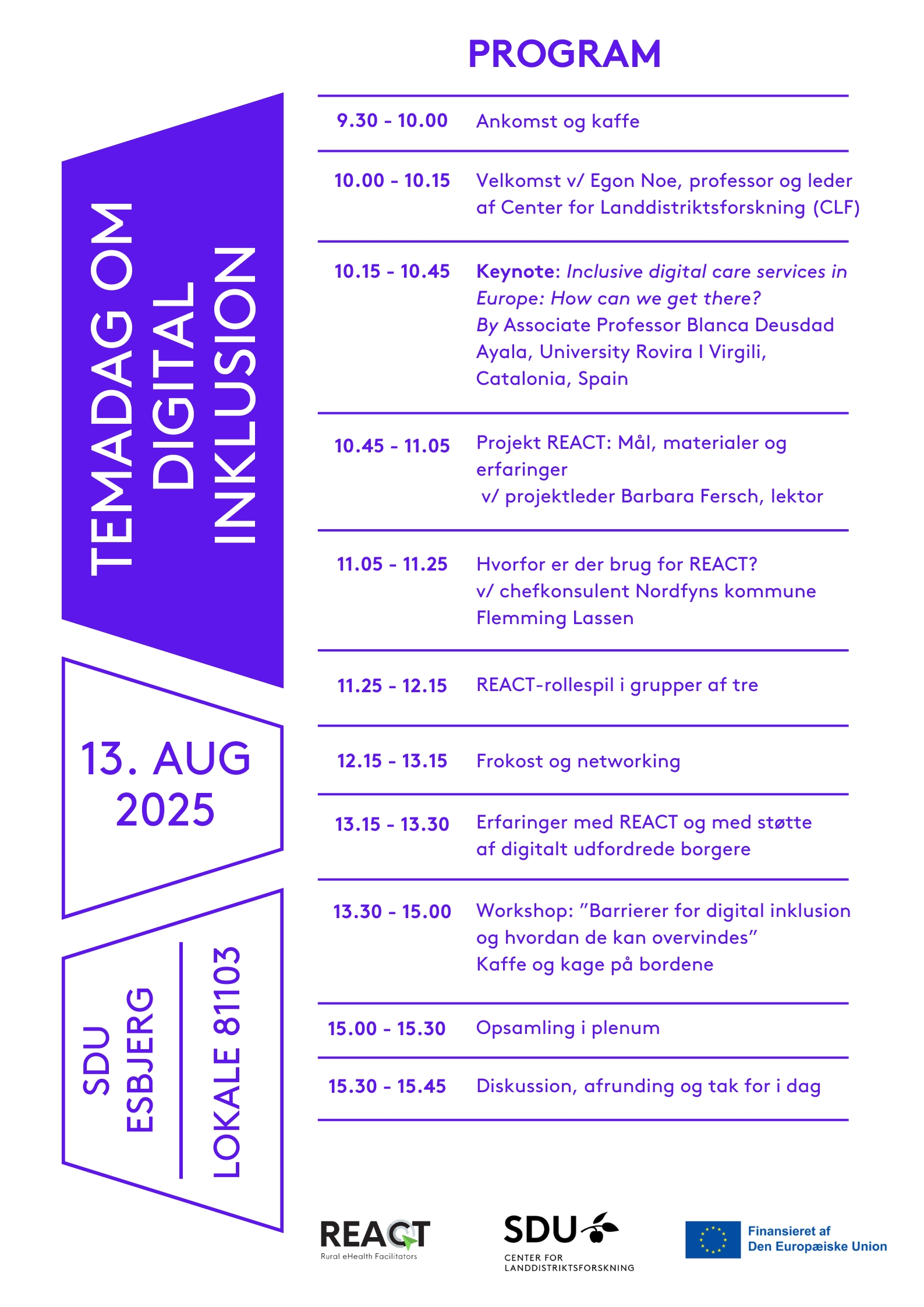 REACT, som er et Erasmus + projekt, har i de sidste 2,5 år arbejdet på at udvikle et koncept til at fremme inklusionen af borgere, som er digitalt udfordrede, og det er blandt andet det arbejde, du kan høre mere om på temadagen.