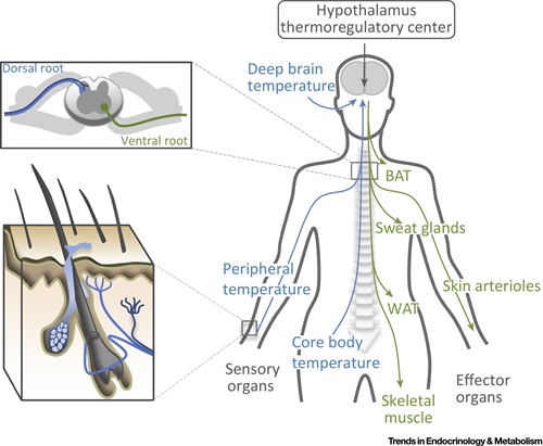 Homeostatic regulation of body temperature is fundamental to mammalian physiology and is controlled by acute and chronic responses of local, endocrine and neuronal regulators. Although the skin is the largest sensory organ of the human body, and plays a fundamental role in regulating body temperature, it is surprising that adaptive alterations in skin functions and morphology by far have been associated to physiological responses to temperature variations in the environment including cold. We address how mammals sense a compromised epidermal barrier and aim at understanding how barrier defects affects systemic metabolism, energy expenditure and metabolic regulations in numerous tissues.