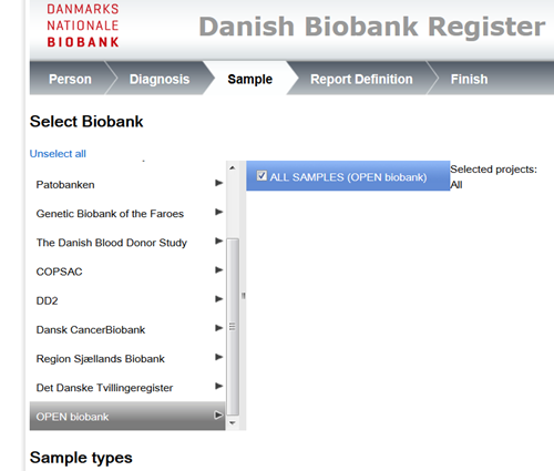 Det Nationale Biobankregister: http://www.biobanks.dk har, som OPEN, til formål at fremme forskningen og udnyttelsen af eksisterende biobanker. Registeret giver et overblik over antal og typer af prøver koblet med demografiske data og diagnoser fra fødsel til død taget fra Landspatientregisteret. For at gøre OPENs biobanker søgbare i Det Nationale Biobankregister, skal OPEN oplyse cprnr. samt type og antal af biologiske prøver til registret. Dette udtræk laves af OPENs datamanagere og sendes til Det Nationale Biobankregister, som herefter kobler disse data med LPR og CPR. Ved søgning i Det Danske Biobank Register vil OPENs biobanker fremstå som én. Hvis en forsker efter søgning i registret kontakter OPEN, enten direkte eller via Det Danske Biobank Register, mhp. at få adgang til de biologiske prøver, vil data bagved søgningen fortælle os, om der er tale om en lille mængde prøver fra mange forskellige OPEN biobanker, eller en større mængde fra en enkelt eller to. OPEN vil videreformidle relevante interessetilkendegivelser/henvendelser til licenstager, som så beslutter om der er interesse for at indlede et forskningssamarbejde. Et samarbejde med udlevering af prøver vil kræve separate myndighedstilladelser.