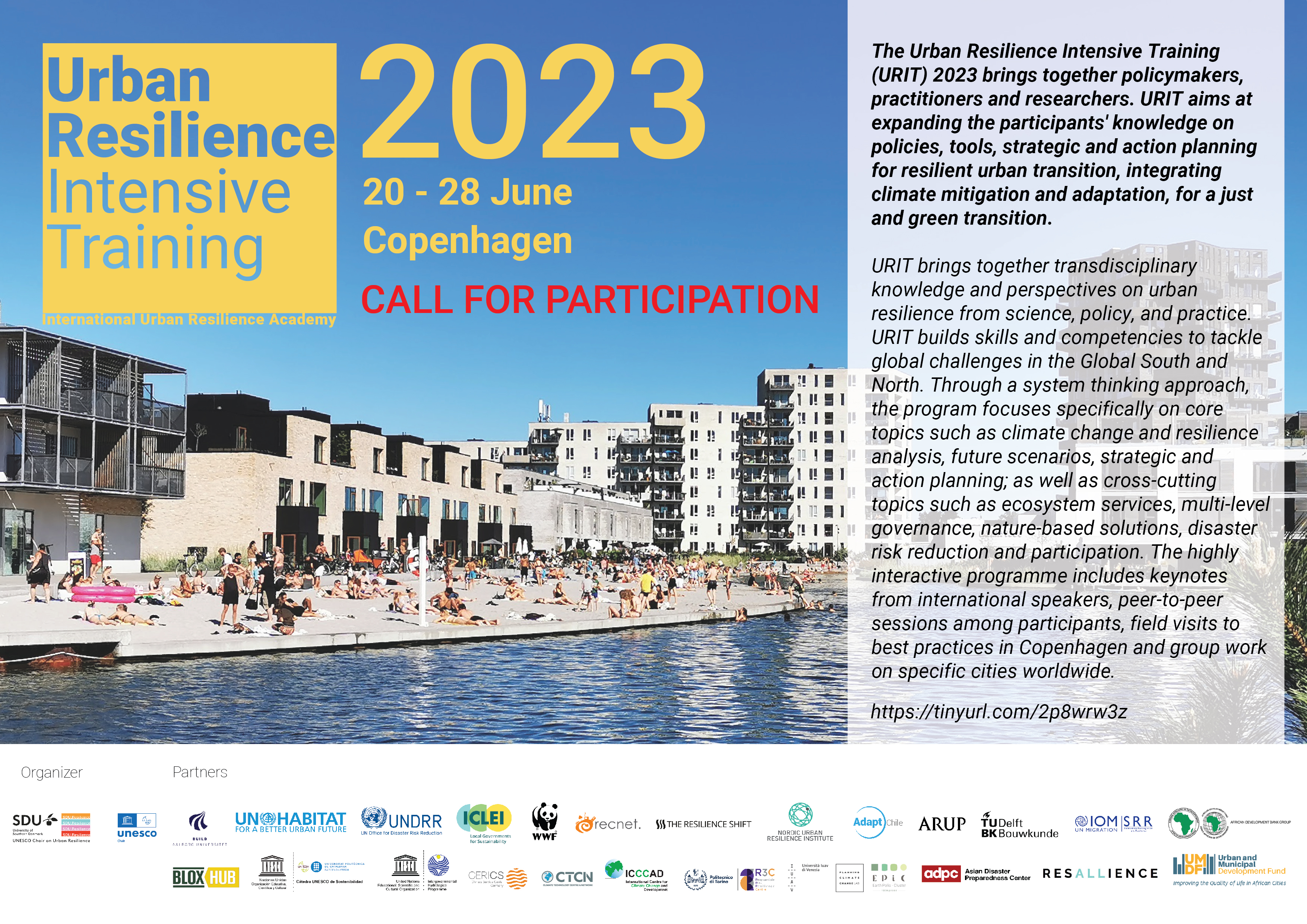 The Urban Resilience Intensive Training (URIT) 2023 brings together policymakers, practitioners and researchers to Copenhagen between the 20th and 28th of June 2023. URIT aims at expanding the participants' knowledge on policies, tools, strategic and action planning for resilient urban transition, integrating climate mitigation and adaptation, for a just and green transition.