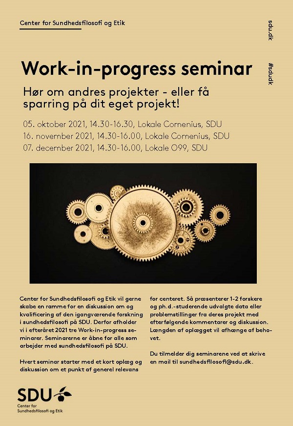 Center for Sundhedsfilosofi og Etik vil gerne skabe en ramme for en diskussion om og kvalificering af den igangværende forskning i sundhedsfilosofi på SDU. Derfor afholder vi i efteråret 2021 tre Work-in-progress seminarer. Seminarerne er åbne for alle som arbejder med sundhedsfilosofi på SDU.