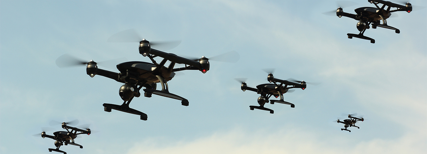 - Den nyeste udvikling er sværmeteknologier. Dronesværme vil snart kunne flyve i koordinerede flokke på op til tusind (eller flere), hvor hver enkelt drone kan være programmeret efter et specifikt mål, som den styrer efter.