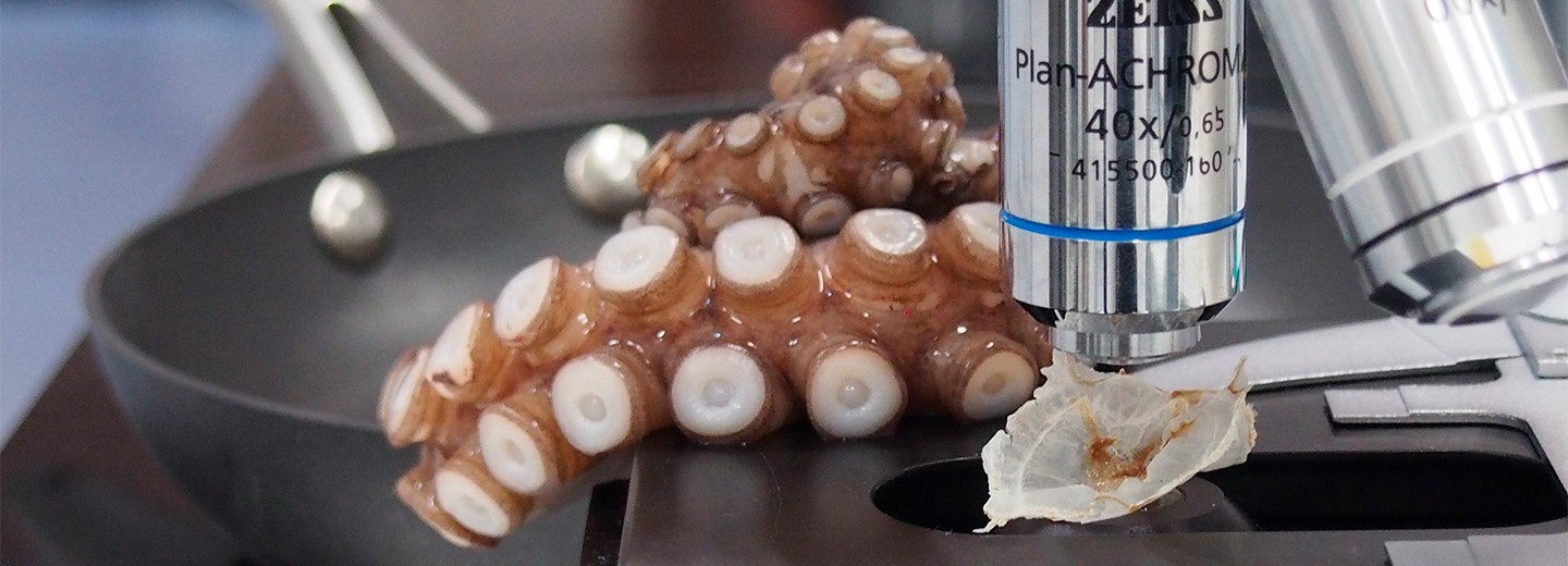- Vi kender effekten af, at blæksprutternes muskler i tilberedningen enten trækker sig sammen og bliver meget seje eller smelter på tungen. Men vi kender ikke årsagen. Den vil vi finde ved at studere madens molekyler under tilberedning med avancerede mikroskopiteknikker, forklarer Mathias Porsmose Clausen.