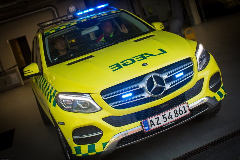 Et øjeblik efter flænses luften af hylende sirener. En lægeambulance nærmer sig med høj fart, og allerede inden den er bremset helt ned, er lægen på vej over til kvinden med en taske i hånden.