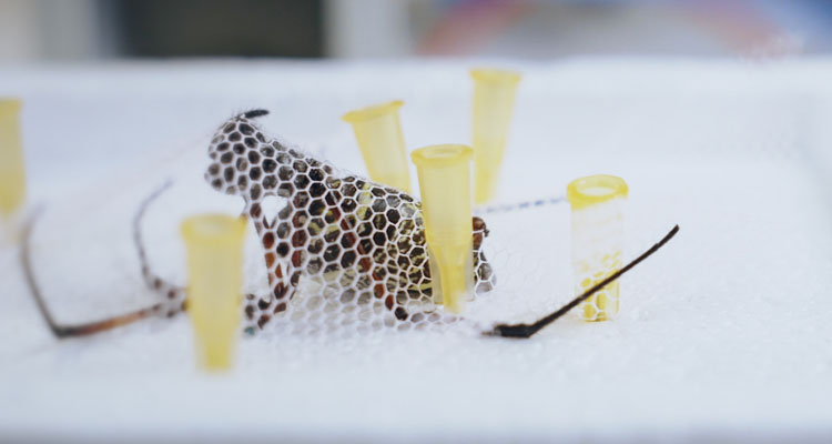 En eller to gange om måneden bliver edderkopperne hentet op i laboratoriet, hvor Iachina høster silketråd fra dem. Tråden, som har et gyldent skær, er kraftig og minder mere om en fiskeline end spindelvæv.