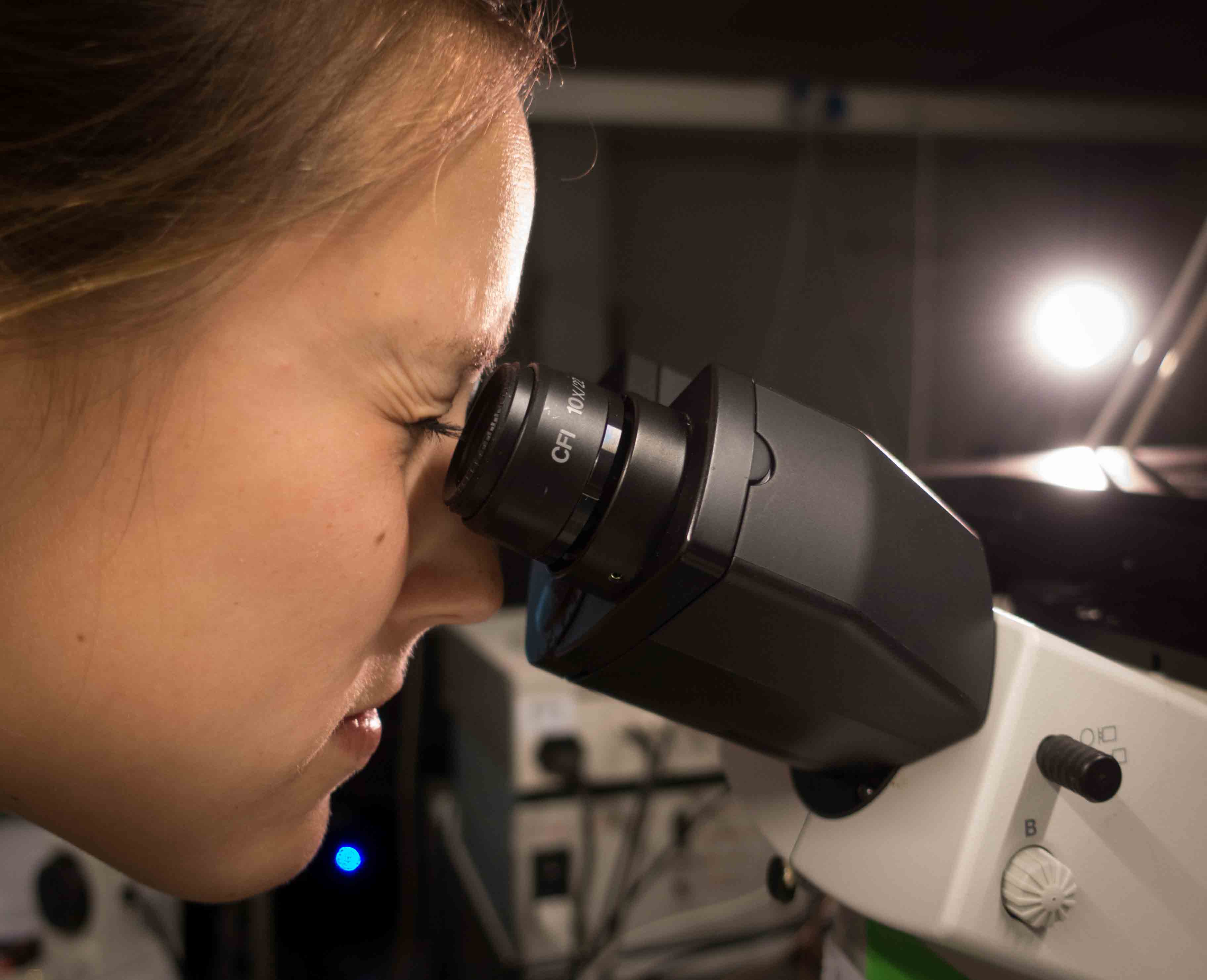 | Irina Iachiva studerer en tråd af edderkoppesilke i mikroskopet. Foto: Anders Boe/SDU. |