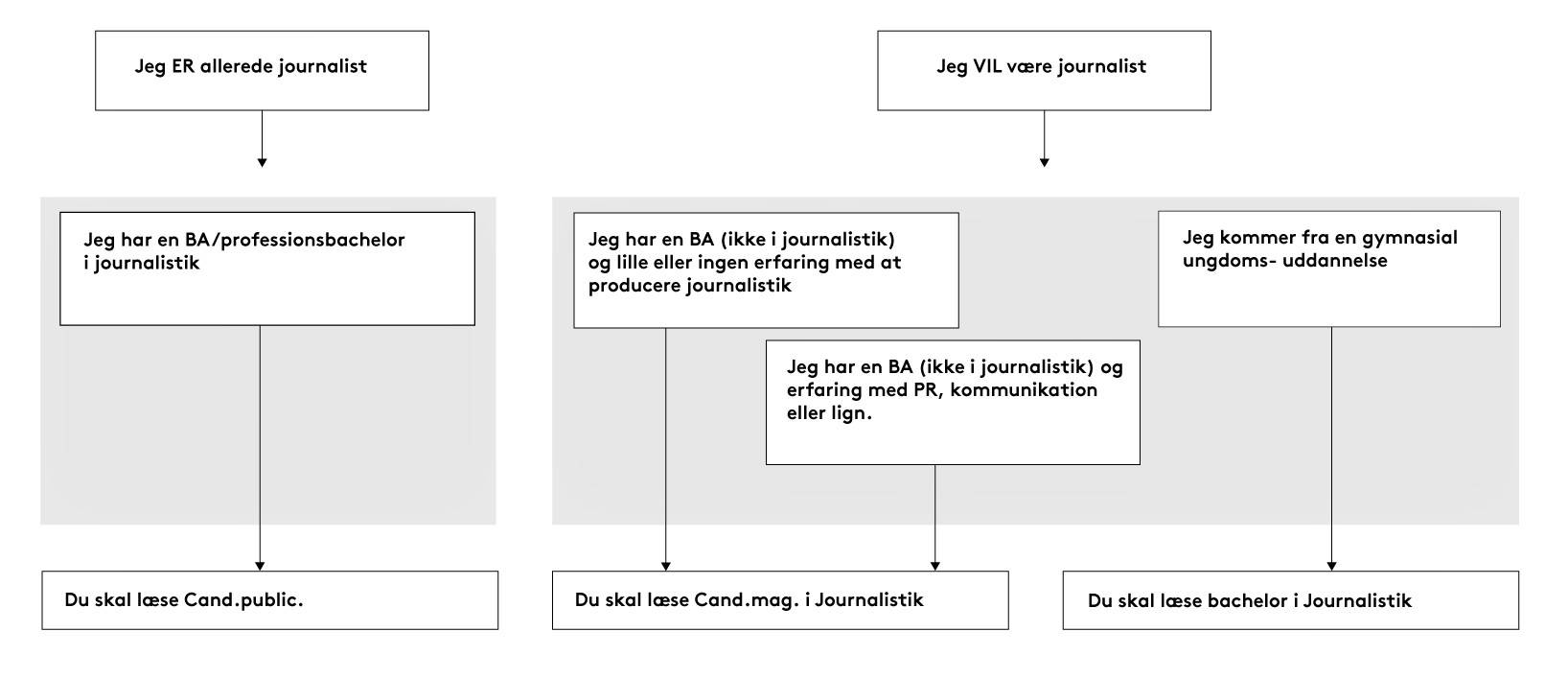 For at sikre at du havner på den rigtige uddannelse, er det vigtigt, at du prøver at finde den rigtige vej i grafikken øverst på siden. Så finder du det helt rigtige match mellem dig og din videre færd ind i journalistikkens verden.
