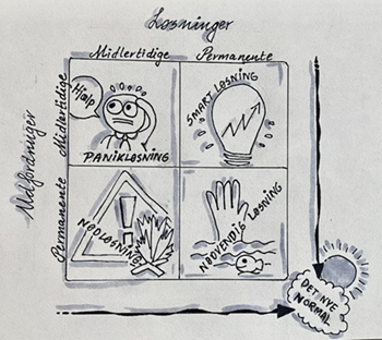 "Det interessante er", fortæller lektor Suna Løwe Nielsen, "at nogle virksomheder forventede en kortvarig krise med midlertidige udfordringer. Andre antog, at krisens udfordringer var et mere permanent bekendtskab. Ligeså opfattede nogle virksomheder deres innovative løsninger - deres svar på udfordringerne - som henholdsvis midlertidige eller permanente. Det giver forskellige typer af kriseinnovation: Panikløsning, smartløsning, nødløsning eller nødvendig løsning".