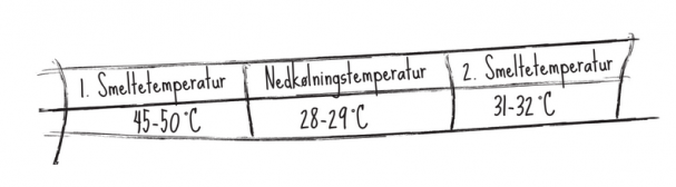 Nedkølingsprocessen er nu i gang, og der dannes “startkrystaller”. Groft sagt er det det samme, der sker, når det sner, hvor snekrystallerne er dannet ved, at der er småpartikler (“startkrystaller“) i luften, som sætter krystalliseringsprocessen af vanddråberne i gang. På en populær måde, kan man sige, at vanddråberne efterligner partiklernes faste form, når de rammer hinanden. Under nedkølingsprocessen kan der desværre blive dannet nogle af de uønskede fedtkrystaller.