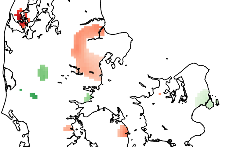 Til gengæld har borgere, der er født eller opvokset på Lolland, Juelsminde og nord for Aalborg, en lavere risiko end landsgennemsnittet. Det gælder også dem, der er født eller opvokset i København og omegn.
