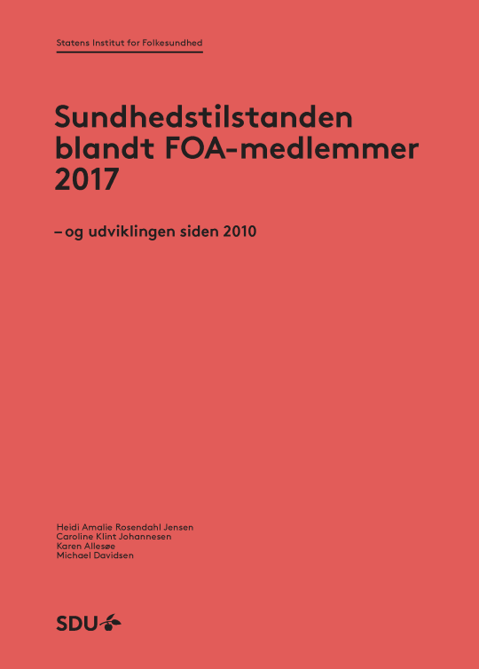 Rapport beskriver sundhedstilstanden blandt FOA-medlemmer i 2017 ud fra en række indikatorer for helbredsrelateret livskvalitet, sundhedsadfærd, sygelighed, sociale relationer, arbejdsforhold samt hospitalskontakter, sygesikringsydelser og indløsning af receptmedicin samt dødelighed.