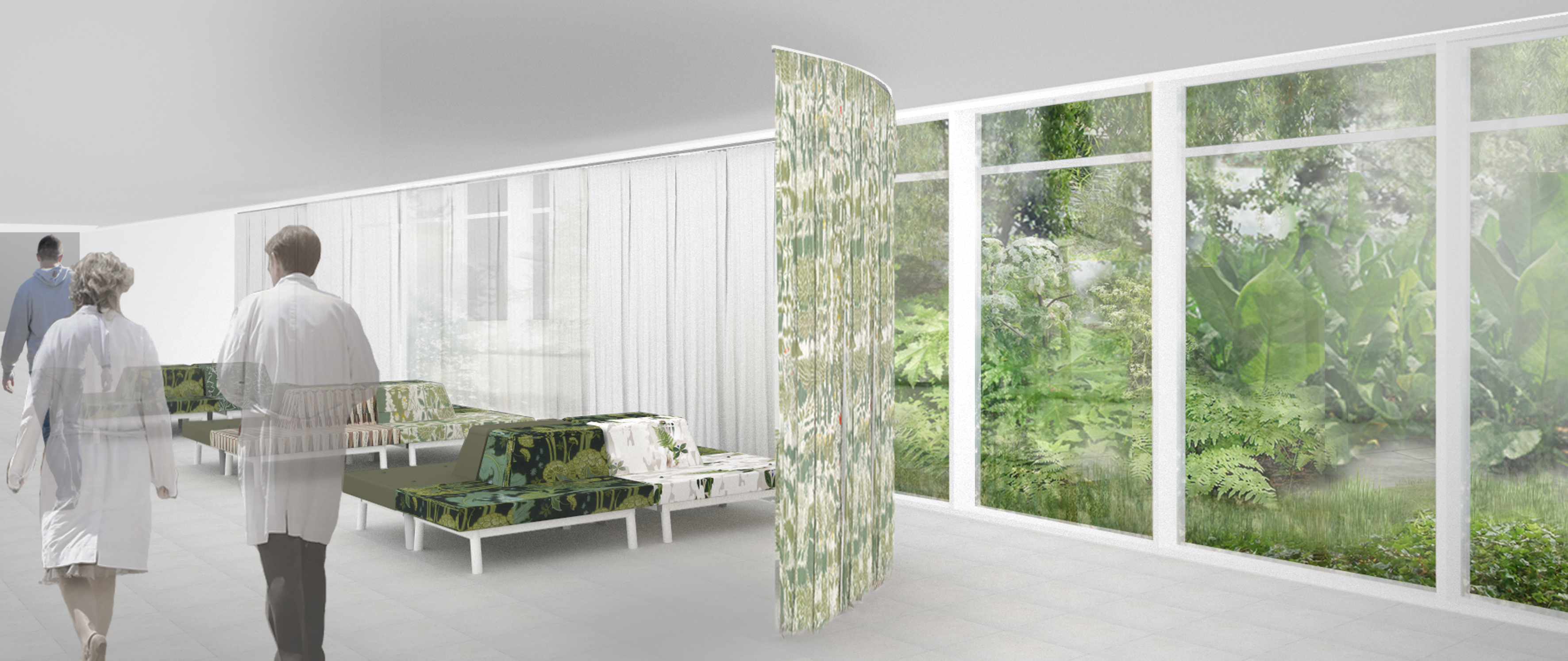 Indenfor sidder du på møbler med plantemotiver, der korresponderer med valg af planter i tilhørende gårdhaver på anden side af vinduet. Sådan gør Starling relationen mellem inde og ude synlig.