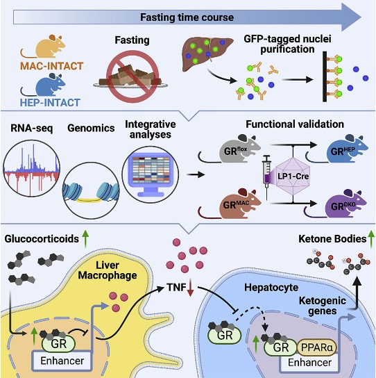 In this study, we demonstrate that the immune system also under healthy conditions has the capacity to fine-tune whole-body metabolism. We identify the glucocorticoid receptor (GR) in liver macrophages as a regulator of key metabolic processes during fasting in mice. During fasting, macrophage GR is capable of suppressing the expression of the inflammatory cytokine, TNF, which in turn promotes nuclear translocation of the hepatocyte version of GR to activate a fat oxidation/ketogenesis-related gene program in concert with the key hepatocyte transcription factor, PPAR&alpha. We believe that the suggested mechanism reveals a general principle by which the immune system can set the metabolic tone during inflammatory diseases and some metabolic disorders.