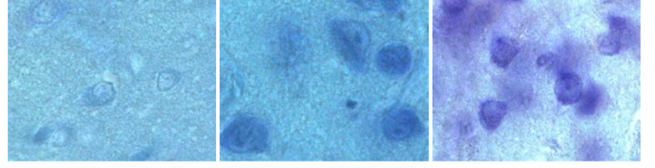 Example of differentiation of Giemsa staining in a section of the brains. From the left: not useful for cell counting; can be used for neuro-counting; can be used for neuron and glial counting.