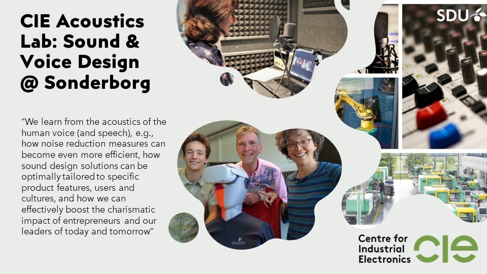 Our R&D activities are highly application-oriented and interdisciplinary. Sound is everywhere, and so must be innovations of sound. Within this conceptual framework, we focus particularly on noise, sound design, digital communication, and digital leadership training. At the heart of our work is the signal that represents the oldest acoustic means of communication among human beings and that is still very directly linked to the ancient emotion and decision-making areas inside our brains: the human voice. That is, we try to learn from the acoustics of the human voice (and speech), e.g., how noise reduction measures can become even more efficient, how sound design solutions can be optimally tailored to specific product features, users and cultures, and how we can effectively boost the charismatic impact of entrepreneurs and our leaders of today and tomorrow (the latter activities take place within the SDU spin-out company AllGoodSpeakers ApS).