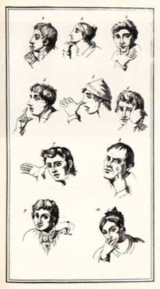 Giorgio Agamben argues in his “Notes on Gesture” (Agamben, 2000) that photography killed gestures by freezing them in time. “By the end of the nineteenth century,” Agamben writes, “the Western bourgeoisie had definitely lost its gestures” (49), and in silent movies and a few other genres, “humanity tried for the last time to evoke what was slipping through its fingers forever” (53). Agamben saw photography as killing gestures by locking them into still slices of time: “images are the reification and obliteration of a gesture (it is the imago as death mask or as symbol)” (54). Cinema, on the other hand, has its center in the gesture, Agamben writes. While this is a seductive line of argument, I must point out that this freezing of gestures was achieved by the detailed drawings of gestures in books on chironomics (as shown in Figure 1 and Figure 2) well before photography was invented. The urge to freeze gestures and categorise them seems more related to the Enlightenment desire for dictionaries and encyclopedias than to the 19th century technology of photography, although perhaps an earlier technology, that of print, can be blamed for the Enlightenment. Elizabeth Eisenstein has argued that print technology is a prerequisite for the kind of large-scale collection, categorizing and distribution that was so important in the Enlightenment era (Eisenstein, 1979), and which we see in the books on chironomics.