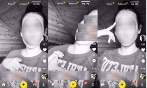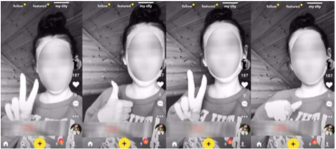 Figure 3: Stills from a musical.ly video showing hand signs to the lyrics “I’m way too good for you.” These images will be further anonymised before publication by tracing over them so only a drawing is shown.