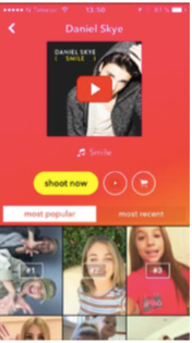 A lipsyncing video with hand movements can be viewed as a performance of a set text, much as a musician plays a tune from sheet music or an actor acts from a script. Of course interpretation and individual choices are involved, but even though two performances of the text may be very differnet, they can generally be recognised as performances of that text. The Musical.ly app encourages this by allowing users to see many performances of the same song. By tapping the small circle in the lower right hand corner when watching a video, we arrive at a page that shows information about the song that was performed, with thumbnail videos of other performances of the same video (see Figure 6).