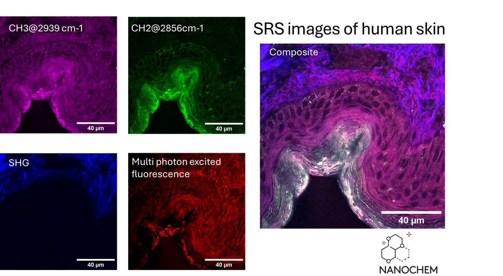 Figure: Label-free imaging of human skin using the BondXplorer™. Individual channels show SRS signals from CH₃ (2939 cm⁻¹, magenta) and CH₂ (2856 cm⁻¹, green), second harmonic generation (SHG, blue), and multiphoton excited fluorescence (red). The composite overlay reveals both chemical composition and structural organization without the need for dyes or labels. Scale bars: 40 μm.