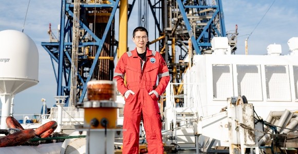 Wenjie on board the Japanese research ship Chikyu - a drilling vessel that can drill thousands of meter below the seabed.