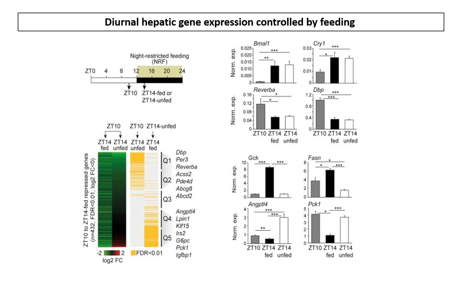 The transition from a fasted to a fed state is associated with extensive transcriptional remodeling in hepatocytes facilitated by hormonal- and nutritional-regulated transcription factors. Here, we use a liver-specific glucocorticoid receptor (GR) knockout (L-GRKO) model to investigate the temporal hepatic expression of GR target genes in response to feeding. Interestingly, in addition to the well-described fasting-regulated genes, we identify a subset of hepatic feeding-induced genes that requires GR for full expression. This includes Gck, which is important for hepatic glucose uptake, utilization, and storage. We show that insulin and glucocorticoids cooperatively regulate hepatic Gck expression in a direct GR-dependent manner by a 4.6 kb upstream GR binding site operating as a Gck enhancer. L-GRKO blunts preprandial and early postprandial Gck expression, which ultimately affects early postprandial hepatic glucose uptake, phosphorylation, and glycogen storage. Thus, GR is positively involved in feeding-induced gene expression and important for postprandial glucose metabolism in the liver.