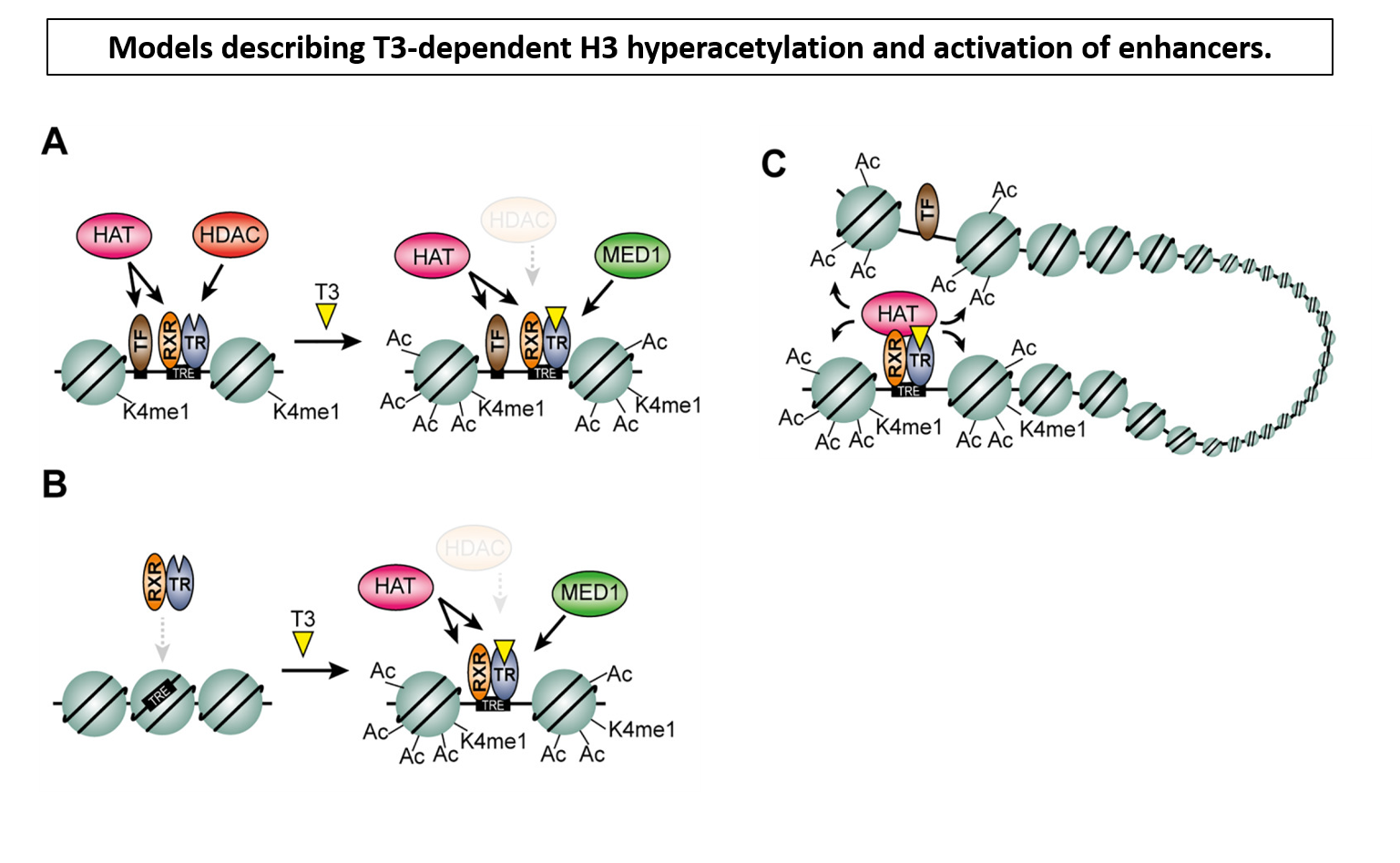 Multiple mechanisms regulate H3 acetylation of enhancers in response to thyroid hormone.