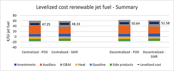 Through calculations, the centralized scenario of renewable jet fuel is found to be the cheapest scenario. Furthermore, the pathway with partial oxidation is the cheapest pathway. Summary of the LCOE of renewable jet fuel on Funen is shown in the below seen column chart.