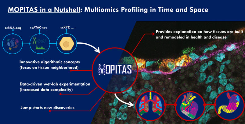 MOPITAS aims to develop experimental techniques and new algorithms to track single cells in space and time by combining spatial transcriptomics (ST) and single-cell RNA sequencing (scRNA-seq). The research could lead to scientific breakthroughs in tissue organization and its disruption in disease, as well as advance the understanding of tissue evolution in general.