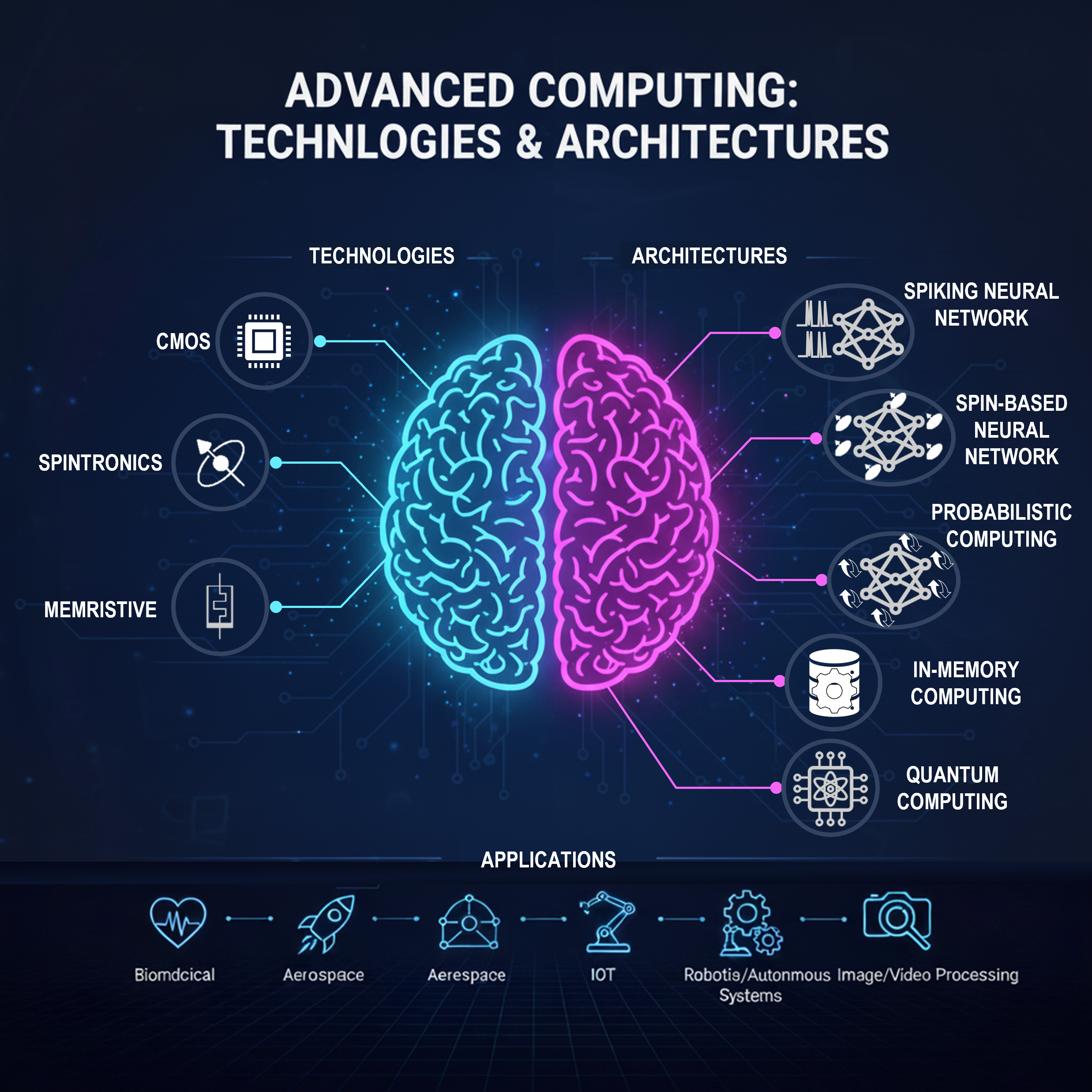 Within this area, we focus on emerging computing paradigms that move beyond the conventional von Neumann architecture, including neuromorphic, probabilistic, spintronic-based quantum, and in-memory computing approaches. At the implementation level, our research also explores technologies beyond traditional CMOS, such as spintronic and memristive devices. The goal is to design and develop highly efficient, low-power, and scalable computing systems for a wide range of applications, including biomedical, aerospace, IoT, robotics, autonomous systems, and image/video processing. Furthermore, the research addresses integration challenges across electronics, spintronics, and photonics, paving the way for future computing systems that combine speed, adaptability, and energy efficiency.