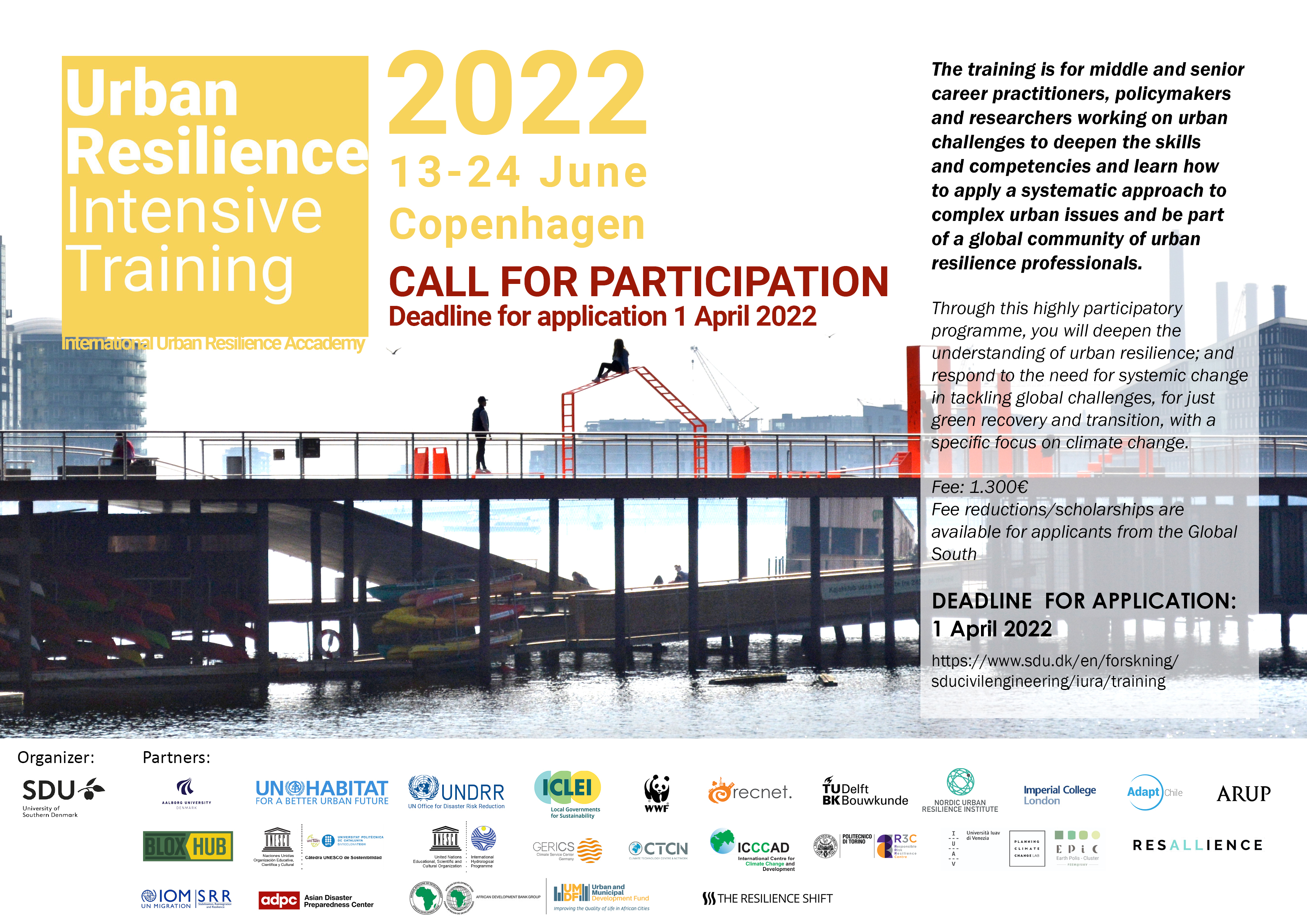 The Urban Resilience Intensive Training 2022 brings together policymakers, practitioners and researchers for two intensive weeks in Copenhagen, 13th – 24th of June 2022. The training aims at expanding the participants' knowledge on policies, tools, strategic and action planning for resilient urban transition, responding to the need for systemic change in tackling global challenges, for a just and green transition, with a specific focus on climate change.