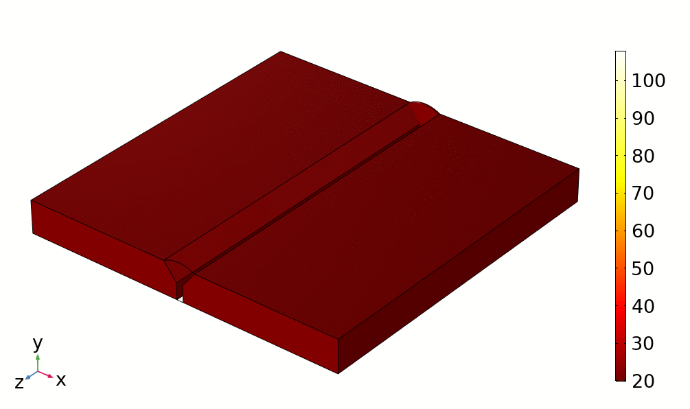 As part of the ShipWeldFlow project, SDU Mechanical Engineering are working to develop a computational model to accurately simulate the thermomechanical effects from welding on large plates. The temperature fields are calculated using a time-dependent heat source simulating the movement of the welding torch. The temperature fields are then coupled to a mechanical response through a thermomechanical and plastic deformation model. The goal is to predict the macroscopic displacements and deformations of large plates, which will be part of large-scale structures such as ship hulls. Once the model has been validated using experimental data, the long-term goal is to use the simulations to optimise the welding sequence to minimise deflections.