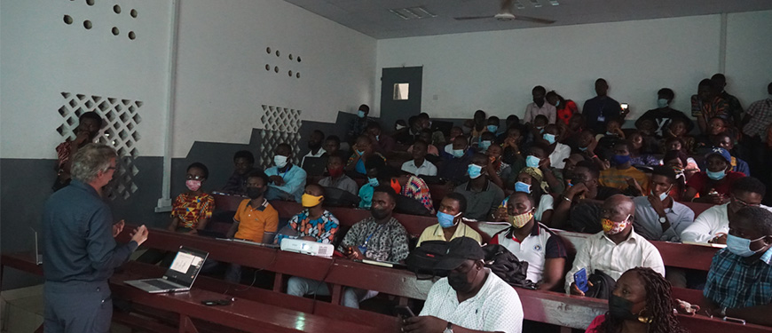 During the corona pandemic in 2021, Associate Professor Kjeld Jensen from SDU UAS Center and SDU-colleague Christian Hammerich from SDU Mechanical Engineering gave a guest lecture on Sustainable research, teaching, and innovation to engineering students and faculty at the Fourah Bay College in Freetown, Sierra Leone, and at the Eastern Technical University in Kenema, Sierra Leone.