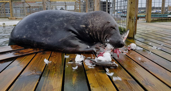 Grey seals hunt different animals. Here, a seal has caught and eats a seagull at University of Southern Denmark marine mammal facility.