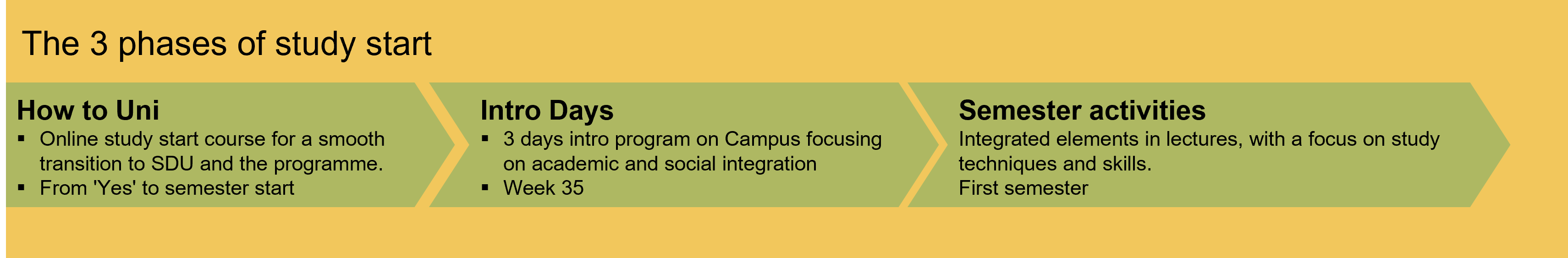 The start of studies is a crucial period for new students in relation to getting a good start on their studies and is of great importance for both completion and well-being. The purpose of the study start is clearly defined: to introduce the students to their programme and create opportunities for both academic and social integration in a safe environment.