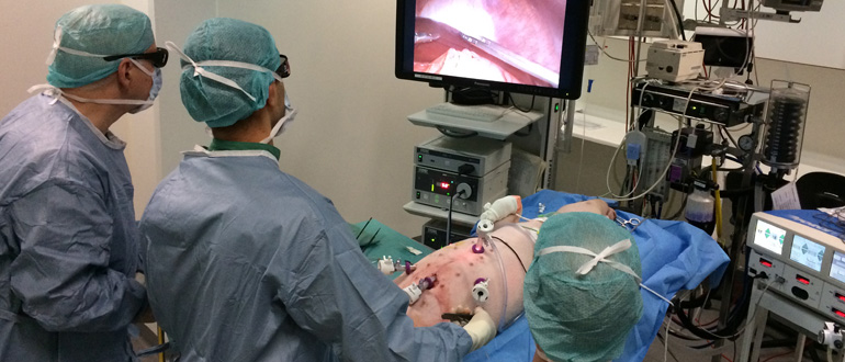 The section for large animal surgery consists of two surgeries with ancillary rooms. Instruments for operative and laparoscopic intervention are available. Imaging possibilities are fluorescence (Ziehm Exposcop), x-ray (Siemens Polymobil) and ultrasonography (Toshiba Powervision 6000). The surgery facilities can be used for surgical training for groups of 12-16 persons.