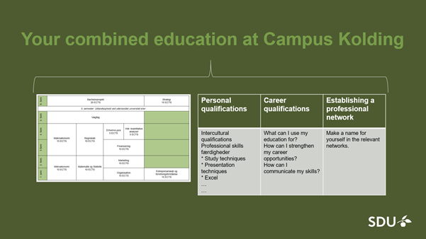 The starting point for the work with The Student’s Journey is an aspiration to make professional competences beyond academic education a part of the student’s curriculum. At SDU, the professional competencies are mostly offered through extra-curricular activities provided by organisations like SDU International, SDU Library and SDU RIO. The Student’s Journey aims at bringing these activities together and incorporate them in the curriculum in a way that is meaningful to students, teachers and the organisations, which provide the activities.