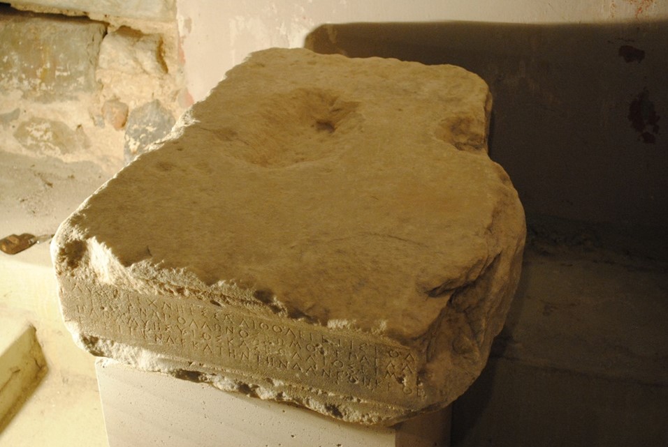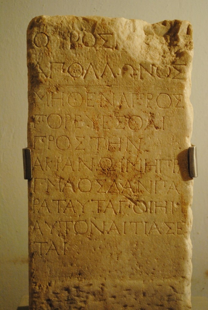 The sanctuary was surrounded by a sacred area, a temenos, marked by border stones of which one is preserved (fig. 2). Its inscription says that this is the border stone of Apollo, and that “no one is to approach the height/citadel, who has no business there”.