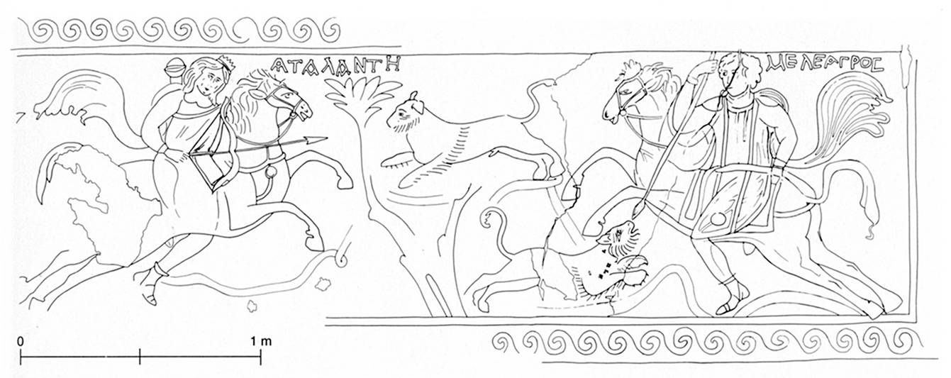 Fig. 9. Mythological hunting scene with Atalanta and Melagros found in Room B. British Museum. The drawing shows the entire panel. The reconstruction is based on photos made in 1856 (I. Bjerg Poulsen).