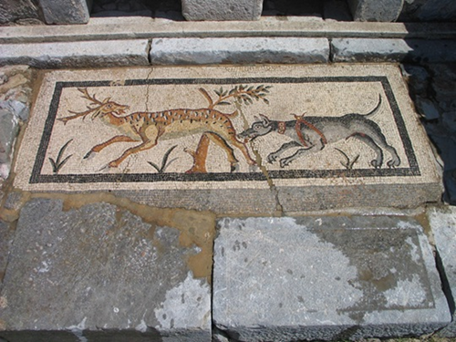 Tomb 2 is located in the north-eastern corner of the necropolis and facing towards the south. The tomb is a temple type with a figured mosaic panel in the anteroom depicting a hunting scene: a dog chasing a stag. Parallels for the mosaic would indicate a date in the second half of the 3rd or beginning of the 4th century AD – and the construction of the tomb itself should presumably also be dated in this period.Tomb 7
