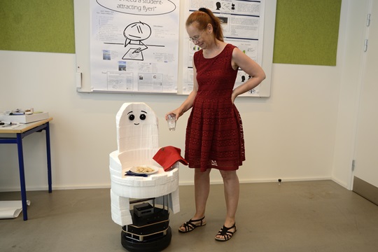Kerstin Fischer illustrates the set-up of an experiment on persuasive dialog using a rough prototype of the robot to be built in the project.